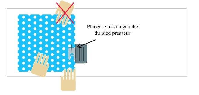 NB: Lorsque vous cousez ne tirez pas sur le tissu, il glisse sous le pied presseur, mais maintenez le légèrement avec la main pour éviter qu’il ne se décale. Ne placez pas vos mains trop près de l’aiguille ou du pied presseur pour éviter tout accident. Positionner vos mains à l’avant de l’ouvrage et non à l’arrière comme sur le shéma ci-dessous, par sécurité ne pas positionner ses mains près de l’aiguille.